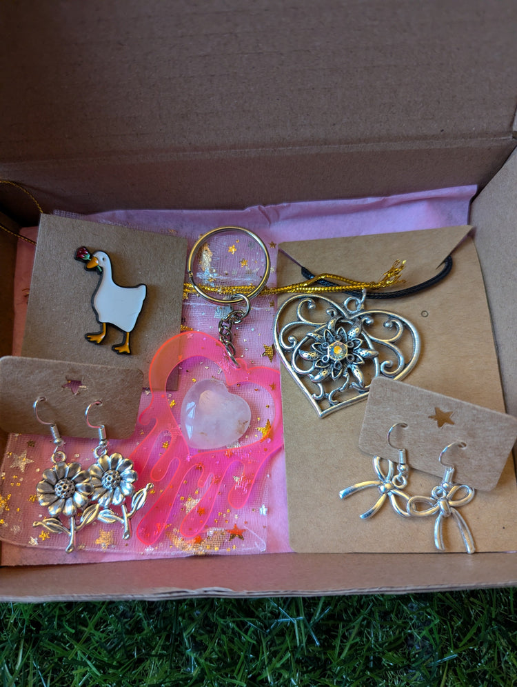 Each box contains a range of our products from necklaces and earrings to bracelets and keyrings! Pin badges and crystals too!